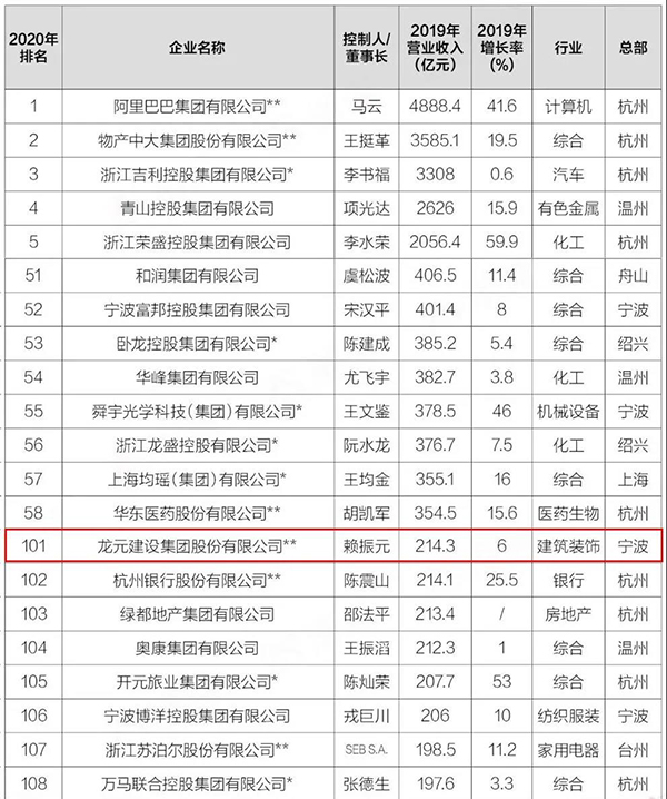 819日,望潮聽濤?浙商全國500強研討會在杭州舉行。會上,由《浙商》雜志獨家制作的“浙商銀行·2020浙商全國500強”榜單正式發布。龍元建設集團以214.3億元的營業收入榮列浙商全國500強第101位。