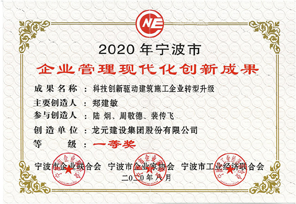 此外,現場還頒發了2020寧波市企業家創業創新獎和企業管理現代化創新成果獎狀和獎牌。集團總裁賴朝暉被授予“2020寧波市企業家創新創業獎”,集團創造的《科技創新驅動建筑施工企業轉型升級》榮獲2020年寧波市企業管理現代化創新成果一等獎。