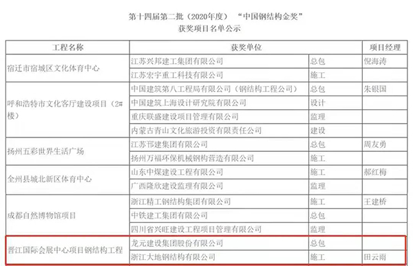 2021年4月,中國建筑金屬結(jié)構(gòu)協(xié)會公布了第十四屆第二批(2020年度)中國鋼結(jié)構(gòu)金獎工程項目名單,全國首個會展類PPP項目、龍元集團首個中標的PPP項目——晉江國際會展中心鋼結(jié)構(gòu)工程榮獲第十四屆第二批“中國鋼結(jié)構(gòu)金獎”。