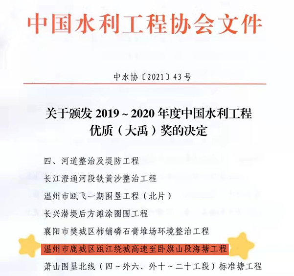 中國(guó)水利工程優(yōu)質(zhì)(大禹)獎(jiǎng)(簡(jiǎn)稱“大禹工程獎(jiǎng)”)是水利工程行業(yè)優(yōu)質(zhì)工程的最高獎(jiǎng)項(xiàng),是以工程質(zhì)量為主,兼顧工程建設(shè)管理、工程效益和社會(huì)影響等因素的優(yōu)秀工程獎(jiǎng)項(xiàng)。本次大禹工程獎(jiǎng)設(shè)置了水庫(kù)樞紐工程、南水北調(diào)工程、河道整治及堤防工程等五大類,全國(guó)僅45項(xiàng)水利工程入圍。海塘工程所在的河道整治及堤防工程名單僅8個(gè)項(xiàng)目入圍。