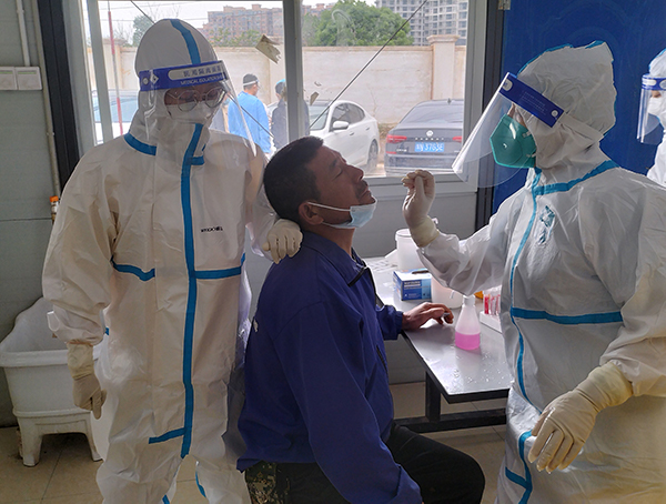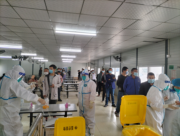 428日下午,項目部召集管理人員,召回現(xiàn)場工人,迅速組織開展全員核酸檢測工作。信息核對、樣本采集、樣品分裝等各個環(huán)節(jié)忙而不亂,急而有序,項目管理人員全部出動,2個半小時配合醫(yī)護人員完成項目部全員1220人核酸采樣工作。