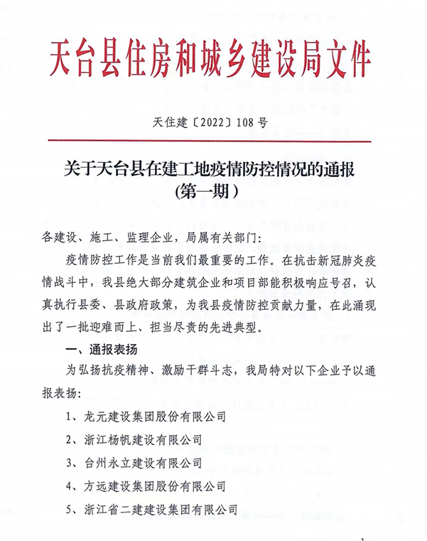 51日勞動節(jié),項目部收到了來自天臺縣住建局的通報表揚:“表揚龍元建設能在戰(zhàn)“疫”危急時刻,主動馳援,充分發(fā)揮企業(yè)優(yōu)勢,積極履行縣里政策要求,對縣內封控區(qū)周邊全區(qū)域進行硬隔離防護工作,用自己的方式支援疫情防控,譜寫了新時代企業(yè)的社會責任與擔當,為天臺縣抗擊疫情防控筑起了一道堅實屏障。”