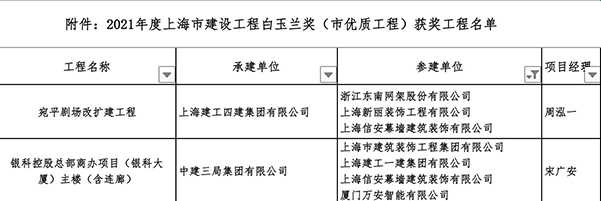 近日,上海市建筑施工行業協會公布了2021年度上海市建設工程“白玉蘭”獎(市優質工程)的獲獎名單。龍元集團生態成員單位信安幕墻承建的“宛平劇場改擴建工程”和“銀科控股總部商辦項目(銀科大廈)主樓”含連廊)”榜上有名。這是信安幕墻繼獲得13項“白玉蘭獎”后,新增添的兩座獎杯。