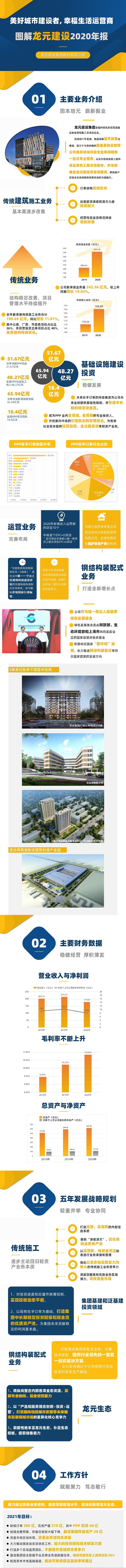 2020年,龍元建設(shè)按照“固本培元,鼎新振業(yè)”的發(fā)展方針,新承接業(yè)務(wù)量242.36億元,較上年同期增長19.02%。傳統(tǒng)施工業(yè)務(wù)方面,公司從項目承接源頭把控風(fēng)險,精選項目,全年新承接傳統(tǒng)施工業(yè)務(wù)合計190.69億元,同比增長11.81%。在PPP業(yè)務(wù)方面,公司根據(jù)外部政策、金融環(huán)境的變化,采取精選項目、嚴(yán)控風(fēng)險的市場策略,謀求健康可持續(xù)發(fā)展,報告期內(nèi)承接PPP項目51.67億元,同比增長56.20%。此外,公司在運營業(yè)務(wù)和鋼結(jié)構(gòu)裝配式建筑業(yè)務(wù)方面也都有重大進(jìn)展。